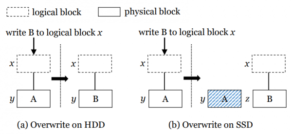 SSD与HDD一个显著地不同是,当逻辑上的覆写发生时,HDD会直接在物理硬件上覆写数据。而SSD通过out-of-place机制覆写。在发生覆写时,SSD把数据写到新的区块中,将旧的区块标记为无效并且通过Garbagae Collegection回收无效区块。