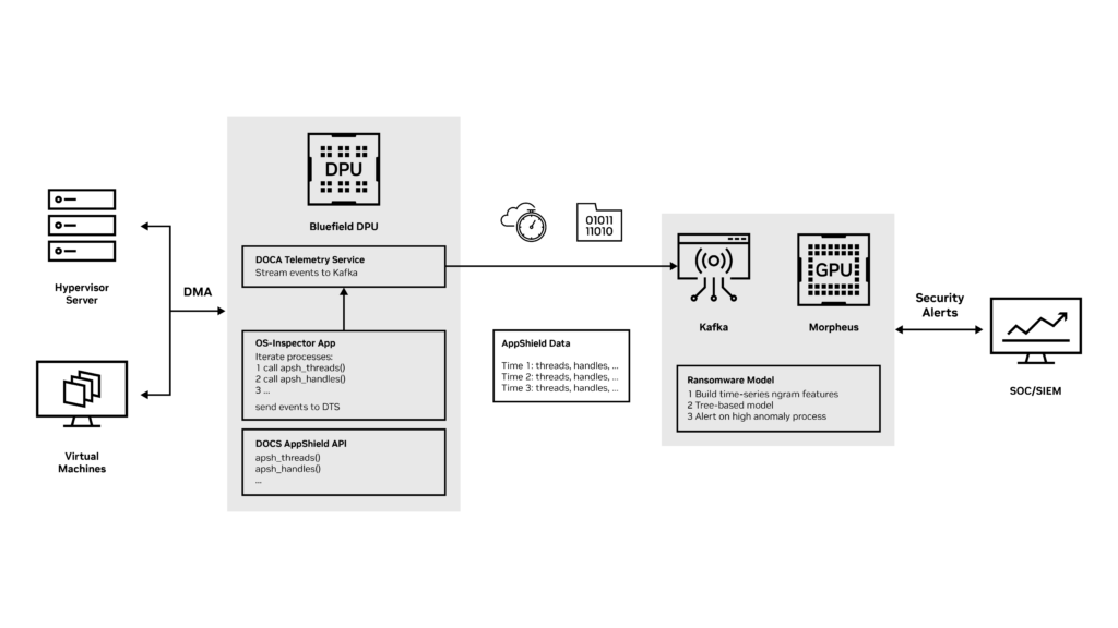 在 Morpheus 中的一个预训练的 AI 模型是勒索软件检测流水线,它利用 NVIDIA DOCA App-Shield 作为数据源。这为检测以前无法实时检测的勒索软件攻击带来了一个新的安全级别。