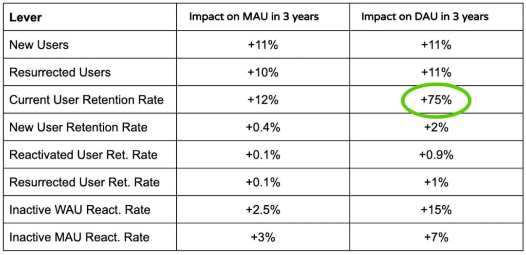 另一个重要的教训是看到一个指标对 DAU 和 MAU 的影响之间的巨大差距;例如,CURR 对 DAU 的影响是其对 MAU 影响的 6 倍。iWAURR(非活跃 WAU 重新激活率)是推动 DAU 的第二大杠杆,但在推动 MAU 方面却排在第四位,落后于增加新用户和复活用户。这意味着,在某个时候,如果我们想看到 MAU 的显著改善,仍然需要找到新的用户获取增长向量。但目前,我们的重点只是推动 DAU,所以我们优先考虑 CURR 而不是其他所有增长杠杆。事实证明,这是正确的选择。