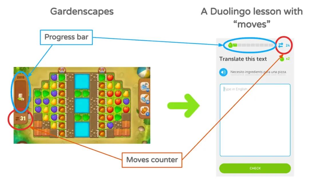 模仿 Gardenscapes,将计数器机制整合到多邻国:给用户有限的机会来正确回答问题,否则他们必须重新开始课程。