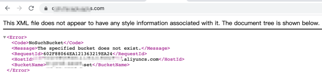 假设有以下一种情况,管理员通过域名解析并绑定了一个存储桶,但是管理员将存储桶删除后,没有将域名解析的CNAME删除,这时会访问域名就会出现上面的情况,NoSuchBucket。