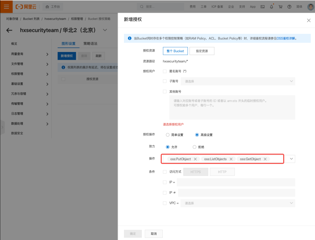 2、如果想列出Object对象,只需要在Bucket授权策略中设置ListObject即可。