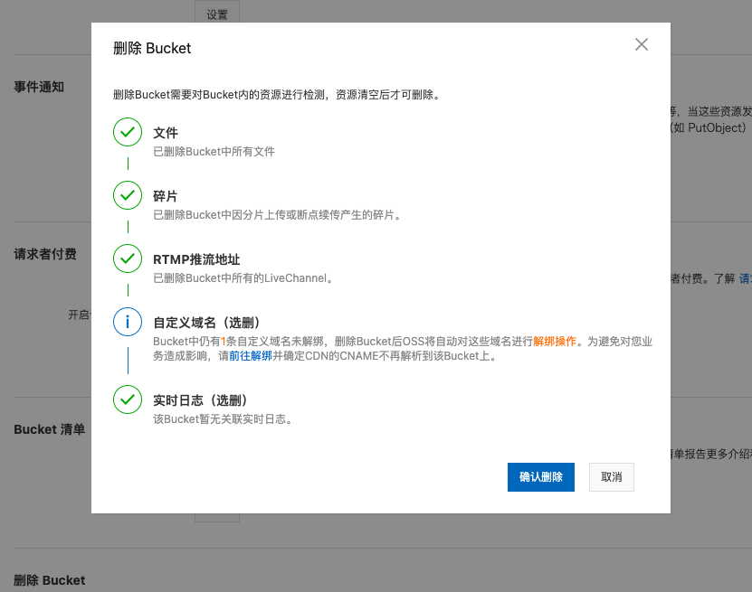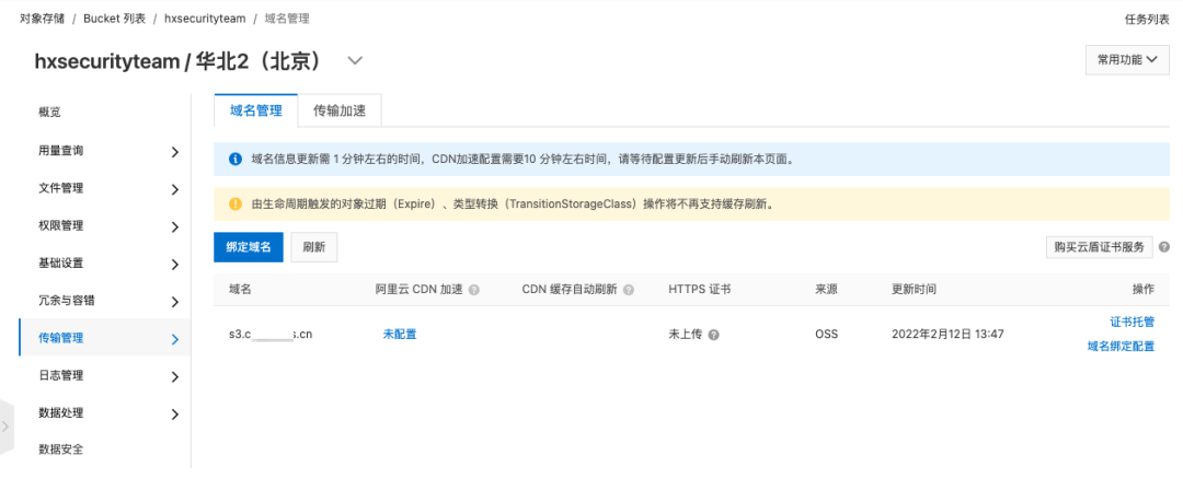 现在阿里云加了限制,必须在传输管理中配置绑定域名即可。以下情况即可接管该存储桶。