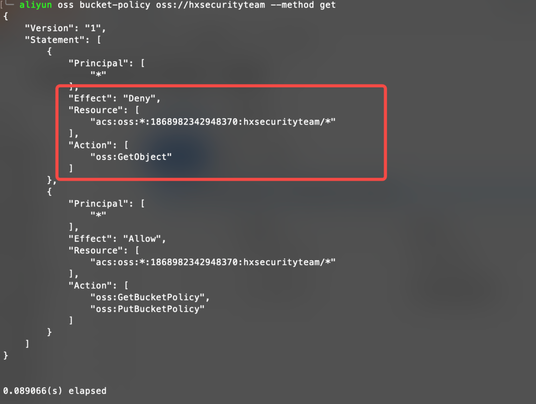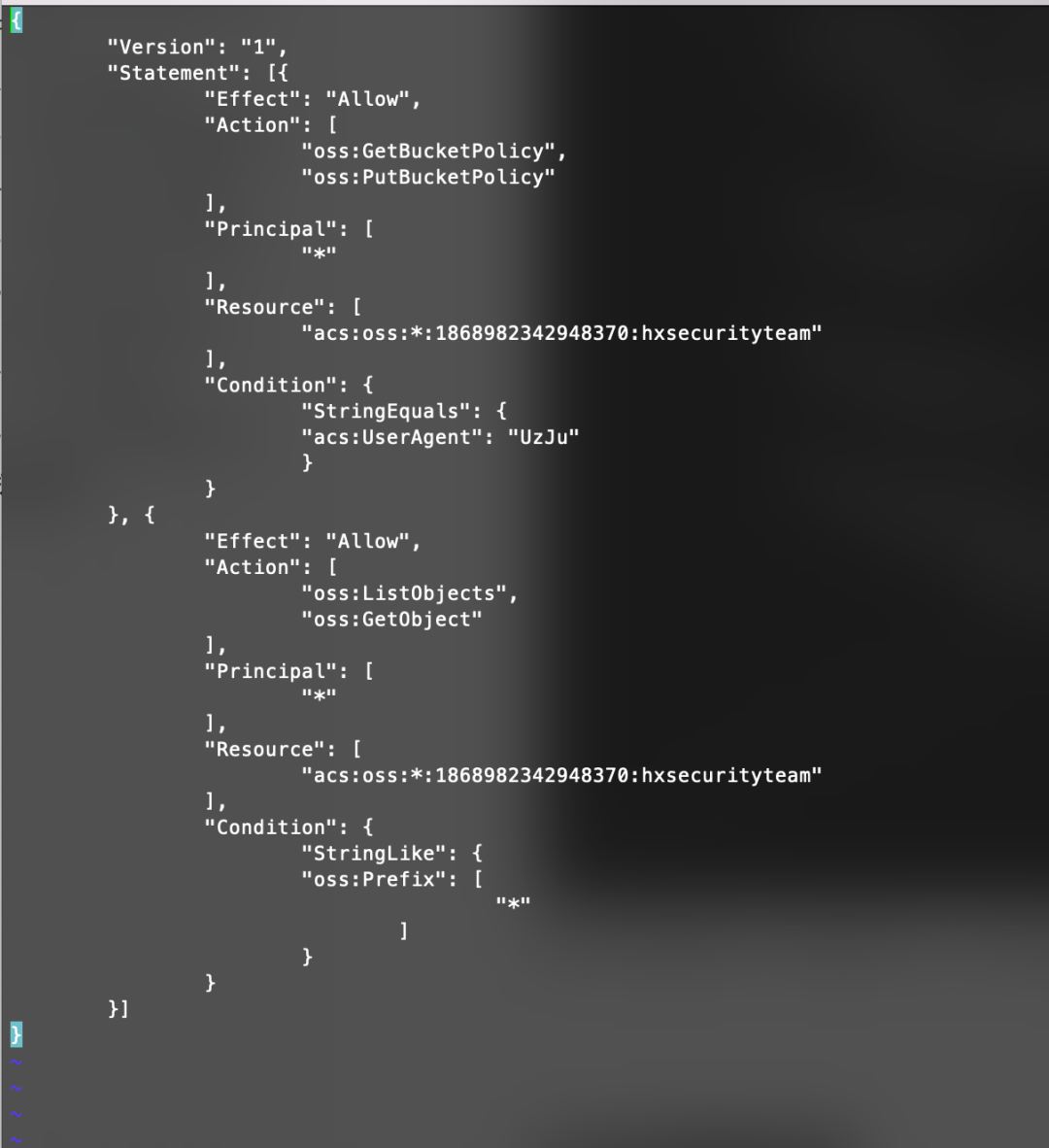 特定的策略配置的指的是,如果管理员设置了某些IP,UA才可以请求该存储桶的话,此时如果错误的配置了GetBucketPolicy,可导致攻击者获取策略配置。