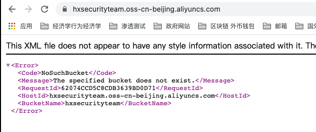 当我们访问存储桶的域名时,提示我们NoSuchBucket,这个时候可以登录自己的阿里云账号,创建同样的名称即可。