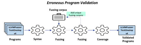 (3) PromptFuzz 使用提供的语料库对这些程序进行模糊测试,并删除任何被监视器检测到偏差的程序。在模糊测试过程中,PromptFuzz 将触发独特行为的输入添加到语料库中,扩展语料库以进行更彻底的基于运行时的验证。模糊测试后,PromptFuzz 计算这些程序达到的代码覆盖率,并删除那些未达到代码覆盖标准的程序,表明库 API 函数得到了充分的利用。