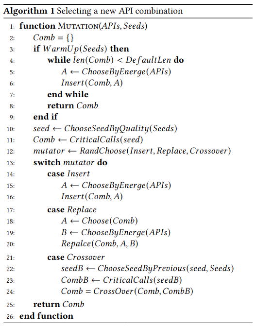 可以说,PromptFuzz的提示词由所选的API集合唯一确定。这样一来,本文所设定的变异提示词的目标就转化为了API集合的变异问题。