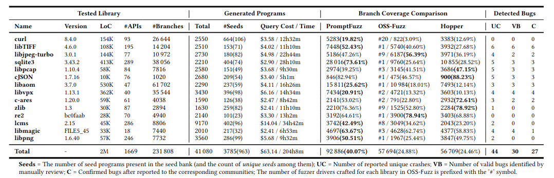PromptFuzz成功地在204小时内为这14个库生成了3785个种子程序,查询LLMs的成本为63.14美元(平均每个库4.15美元)。总体而言,PromptFuzz生成的模糊测试驱动程序在测试库上实现了40.07%的分支覆盖率,比OSS-Fuzz高1.61倍,比Hopper高1.63倍,并在24小时的实验中检测到了30个之前未知的错误。所有发现的错误均已报告给相应的社区。