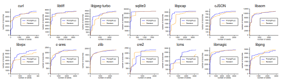 覆盖率引导的提示词变异。图5显示了使用两种不同的变异方法配置时,生成的种子程序在PromptFuzz的模糊循环期间获得的累积覆盖分支。在给定相同的查询预算时,覆盖引导变异在14个库中的11个库中优于随机盲变异,但libaom、zlib和libpng除外。尽管在预热阶段分支覆盖的增长率较低,但由于覆盖和种子程序获得的反馈,覆盖引导变异在11个库中超过了随机盲变异。这使PromptFuzz能够改变包含API函数的有意义组合的提示,创建达到更深层库状态的程序。