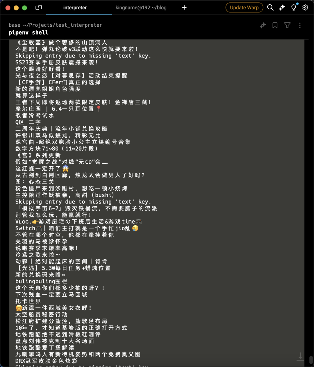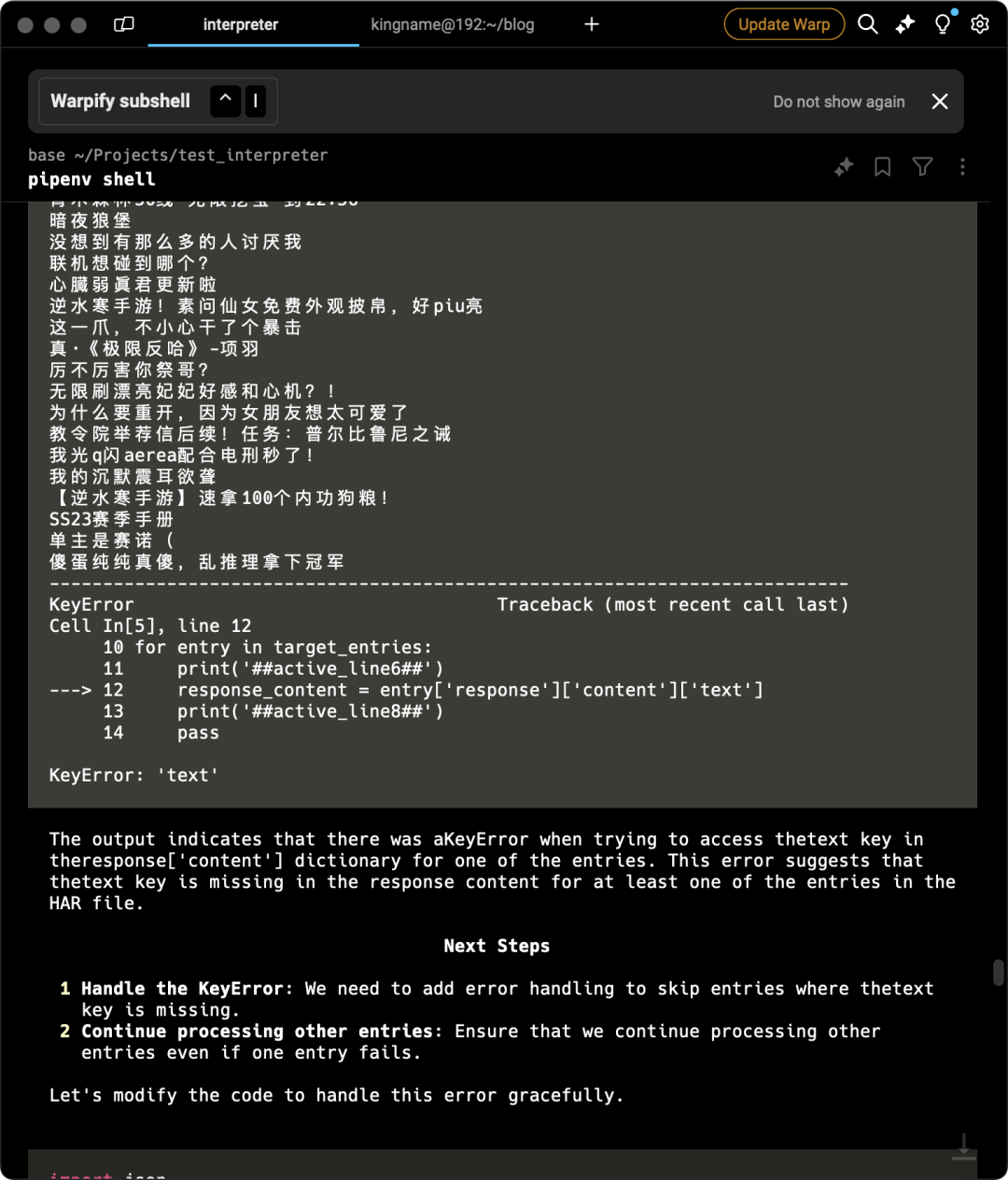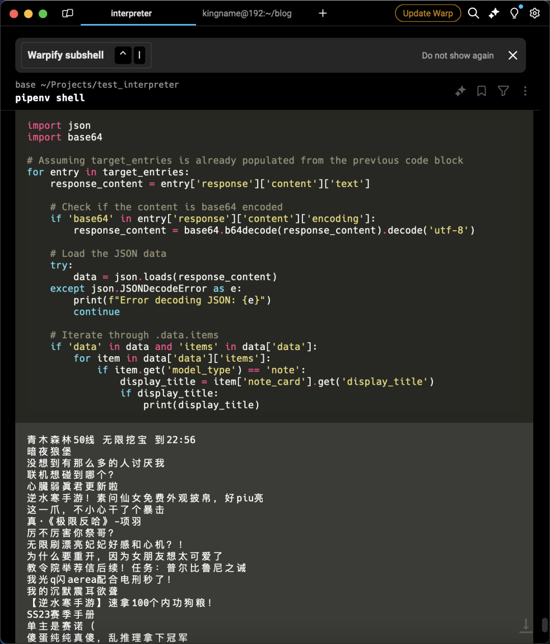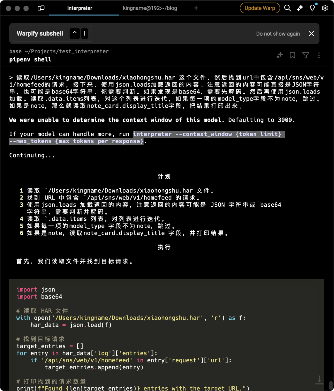 interpreter.chat('读取/Users/kingname/Downloads/xiaohongshu.har 这个文件,然后找到url中包含/api/sns/web/v1/homefeed的请求,接下来,使用json.loads加载返回的内容。注意返回的内容可能直接是JSON字符串,也可能是base64字符串,你需要判断。如果发现是base64,需要先解码。然后再使用json.loads加载。读取.data.items列表,对这个列表进行迭代,如果每一项的model_type字段不为note,跳过。如果是note,那么就读取note_card.display_title字段,把结果写入到note_title.txt文件中')