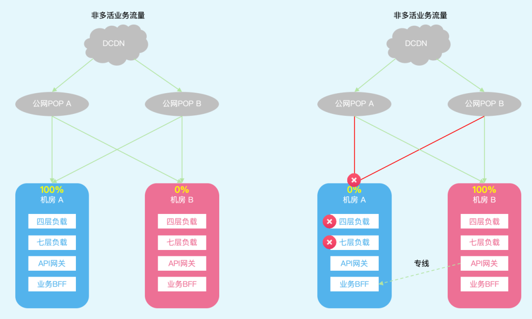 部分业务当前是没有多机房多活部署的,仅在一个机房可以处理流量;因此在原来的方案中,这部分非多活业务流量只会回源至机房 A,无法应对机房 A 公网入口故障。如同本次事故中,非多活业务流量无法切流止损,依赖降级走CDN专线节点。