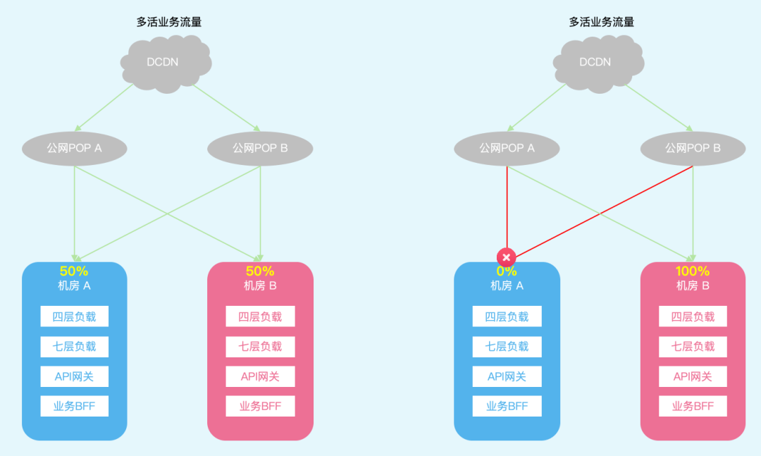 然而本次故障中双 POP 至机房 A 故障,相当于机房 A 公网脱网。不同于单 POP 故障,常规双 POP 之间互相容灾方案无法生效。除了几个核心业务场景因前置配置了机房级别的故障容灾策略未受影响外,非自动容灾的多活业务需要执行机房维度切流进行止损。由于DCDN 专线节点可以通过 B2-CDN 环网专线回源不受本次故障影响,最终成为了非多活业务的逃生通道。