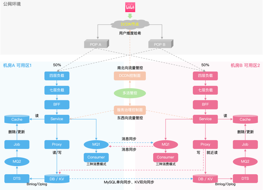 当前我站业务主要为同城多活架构,如图4所示,我们将多个机房逻辑上划分为两个可用区,每个可用区日常承担50%的流量,将整体多活架构分层来看: