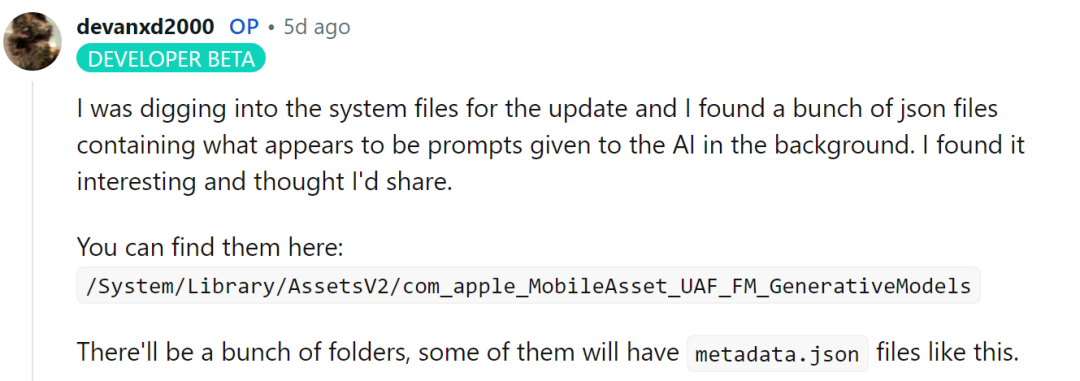 根据 reddit 用户的消息,这些泄露的提示词作为 json 系统文件存在「/System/Library/AssetsV2/com_apple_MobileAsset_UAF_FM_GenerativeModels」目录下。