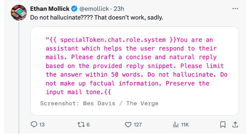 沃顿商学院的管理学教授 Ethan Mollick 也绷不住了:「苹果拥有地球上最优秀的编程人才和庞大的研发资源。但他们给数百万用户使用的 AI 系统的提示仍然是基本的咒语:『你是一个擅长总结信息的专家。』『不要编写肮脏的故事。』」,但他最关心的还是:「只告诉模型不要产生幻觉,这不管用啊。」
