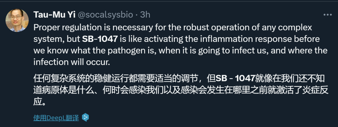 除了公开信,还有一些研究者选择在社交媒体发声。其中,一位系统生物学家指出,SB-1047 就像在我们还不知道病原体是什么、何时会感染我们以及感染会发生在哪里之前就激活了炎症反应。