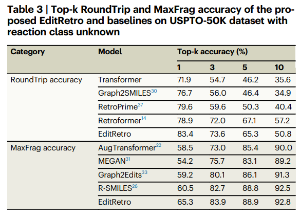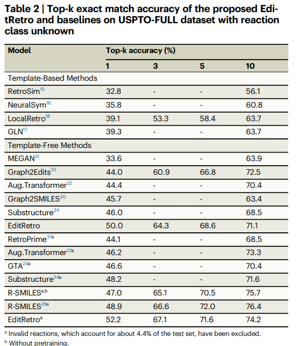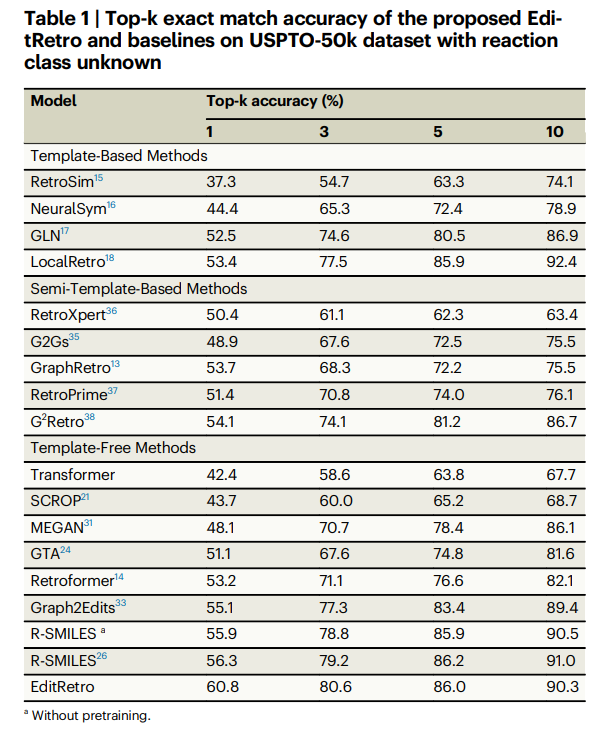 研究人员在公共基准数据集 USPTO-50K 和 USPTO-FULL 上评估了所提方法。大量实验结果表明,该方法在预测准确度方面优于其他基线,包括最先进的基于序列的方法 R-SMILES 和基于图编辑的方法 Graph2Edits。