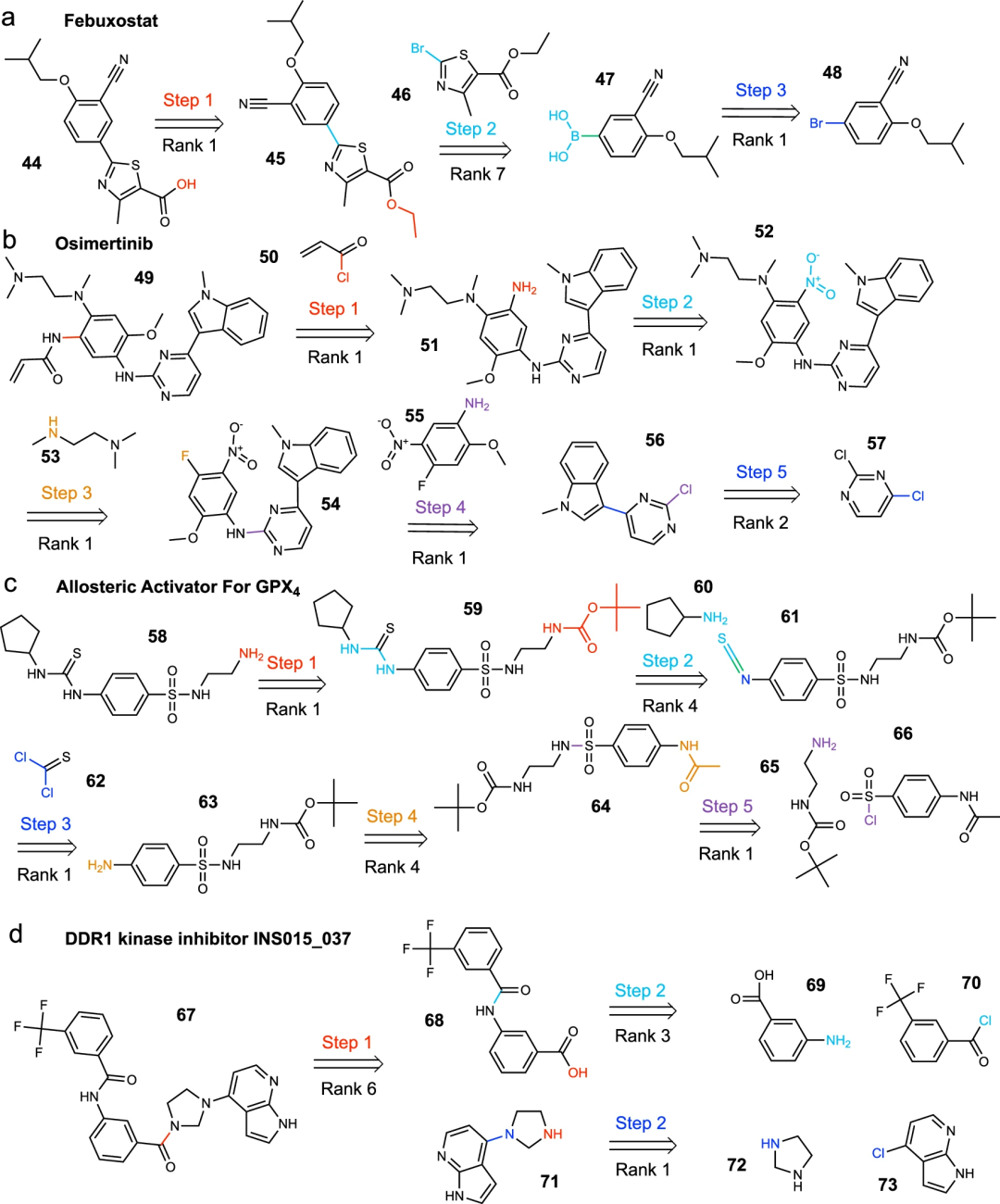 为了评估 EditRetro 在合成规划中的实用性,通过连续的逆合成预测设计完整的化学途径。研究人员选择了四种具有重要药用价值的目标化合物进行评估:非布司他、奥希替尼、GPX4 的变构激活剂和 DDR1 激酶抑制剂 INS015_037。