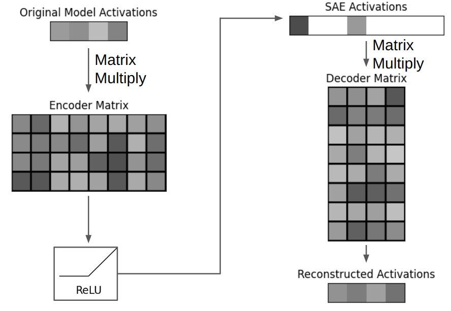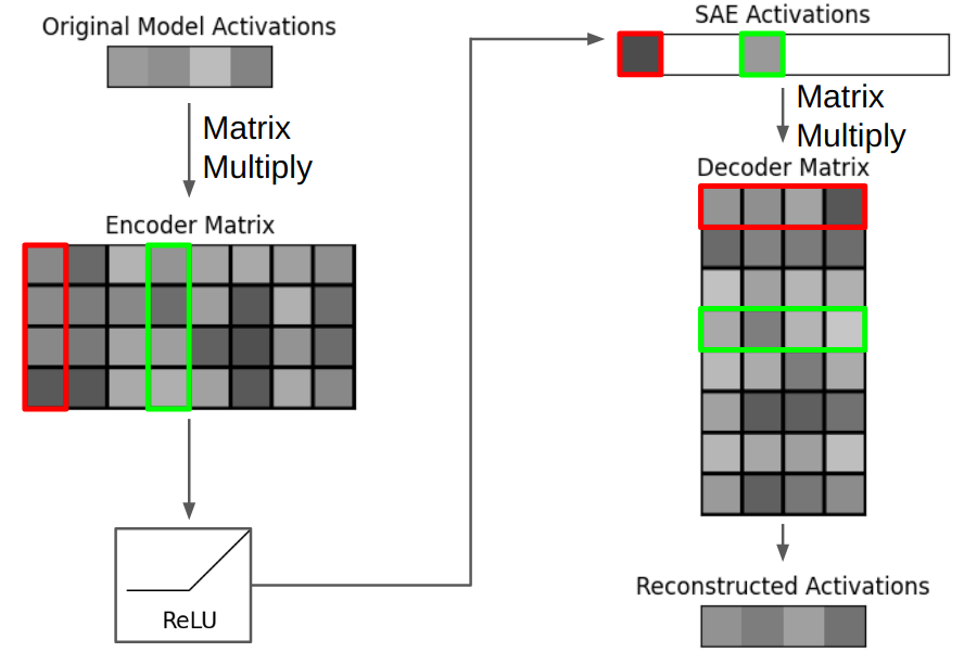 我们可以使用 SAE 来理解这种中间激活。SAE 基本上就是「矩阵 → ReLU 激活 → 矩阵」。