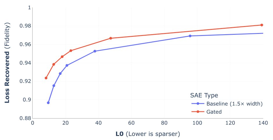 在比较 SAE 时,一种常用方法是绘制这两个变量的图表,然后检查它们之间的权衡。为了实现更好的权衡,许多新的 SAE 方法(如 DeepMind 的 Gated SAE 和 OpenAI 的 TopK SAE)对稀疏度惩罚做了修改。下图来自 DeepMind 的 Gated SAE 论文。Gated SAE 由红线表示,位于图中左上方,这表明其在这种权衡上表现更好。