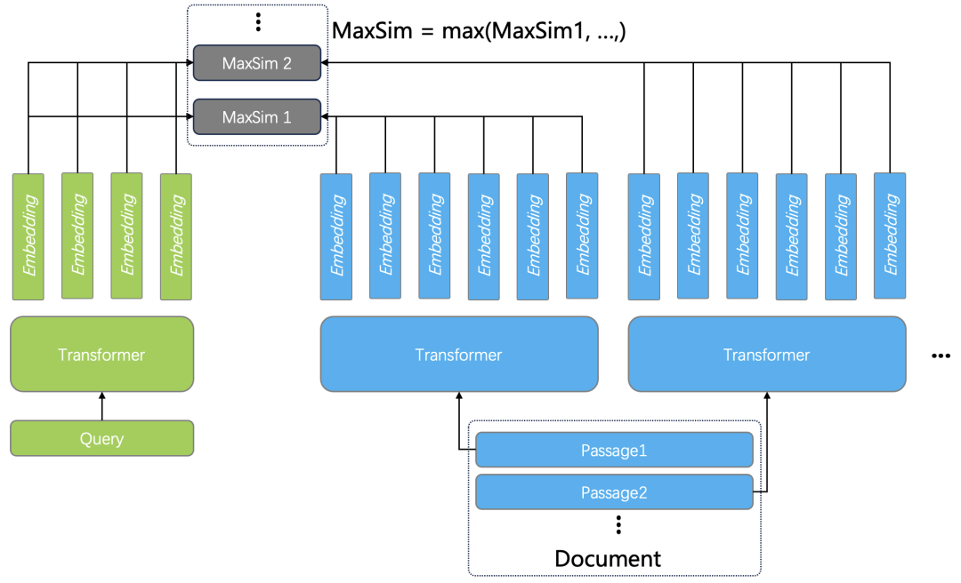 一篇超过 ColBERT 限制的文档,会被切分成多个段落,分别编码生成 Tensor 后,都跟原始文档保存在一行。计算 MaxSim 的时候,查询跟这些段落分别计算,然后取最大值作为整个文档的打分。如下图所示: