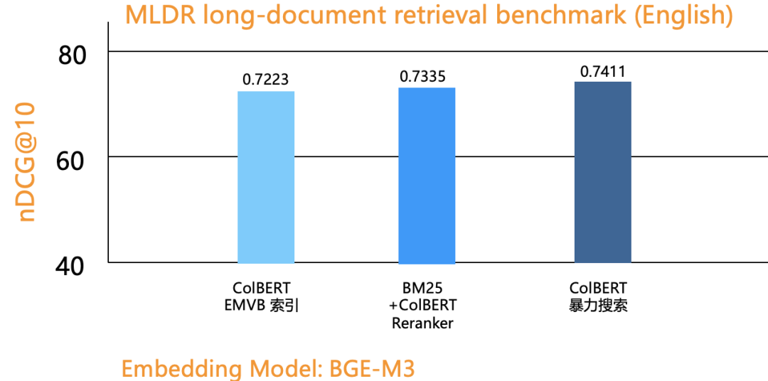 可以看到,相比 Reranker ,即使是采用没有精度损失的暴力搜索,也没有显著的提升,而采用基于 Tensor Index 的排序质量甚至低于采用 Reranker。然而,作为 Ranker 的查询时间却要慢得多:MLDR 数据集包含 20 万文档数据,大约 2GB 左右,采用 Jina-ColBERT 转成 Tensor 数据后,高达 320 G,这是因为 Tensor 数据类型是把一篇文档的每个 Token 对应的向量都要保存下来, ColBERT 模型的维度是 128 维,因此默认数据量会膨胀 2 个数量级,即使构建了 Tensor Index,在查询这么多数据的时候,也需要平均 7s 才能返回一个查询,但得到的结果却并没有更好。