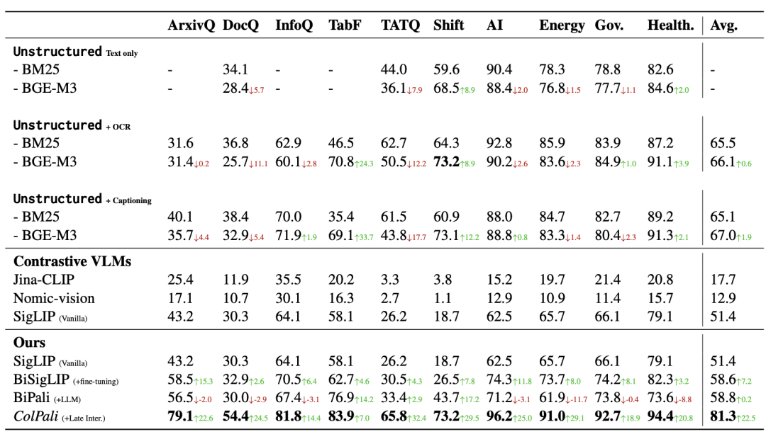 ColPali 模型的训练跟 ColBERT 类似,也是采用查询 - 文档页面对的形式,从而捕获查询和文档多模态数据之间的语义关联,只是采用 PaliGemma 【参考文献 10】用来生成多模态 Embedding 。相比没有采用 Late Interaction 机制但同样采用 PaliGemma 生成 Embedding 的方案 BiPali,在 nDCG@5 的评测指标对比是 81.3 vs 58.8,这种差距是就是 “极好” 和 “压根不能工作” 的区别。