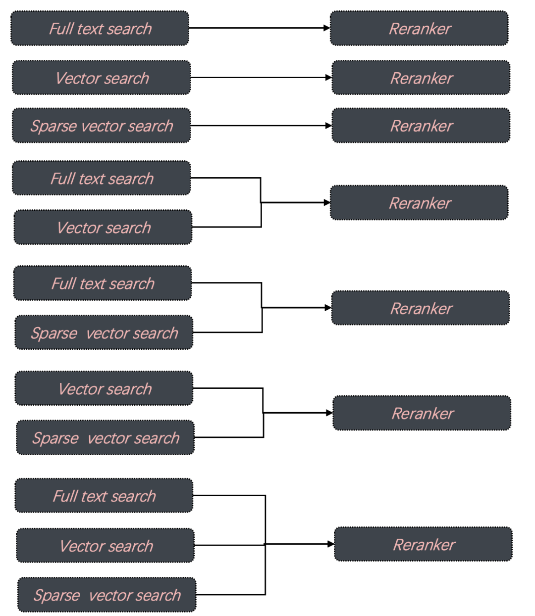 **评测一:ColBERT 作为 Reranker 是否有效。**将 20 万 MLDR 数据分别用 BGE-M3 生成稠密向量和稀疏向量,并插入到 Infinity 数据库中,数据库包含 4 列,分别保存原始文本,向量,稀疏向量,以及 Tensor,并分别构建相应全文索引、向量索引、稀疏向量索引。评测包含所有的召回组合,包含单路召回、双路召回,以及三路召回,如下所示: