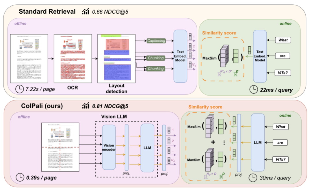 由此可以看到,ColBERT 及其延迟交互模型,在 RAG 场景具有很大的应用价值,以上是在文本对话内容生成的相关工作,近期,延迟交互模型在多模态场景,也得到了 SOTA 的结果。这就是 ColPali【参考文献 9】,它改变了 RAG 的工作流程,如下图所示: