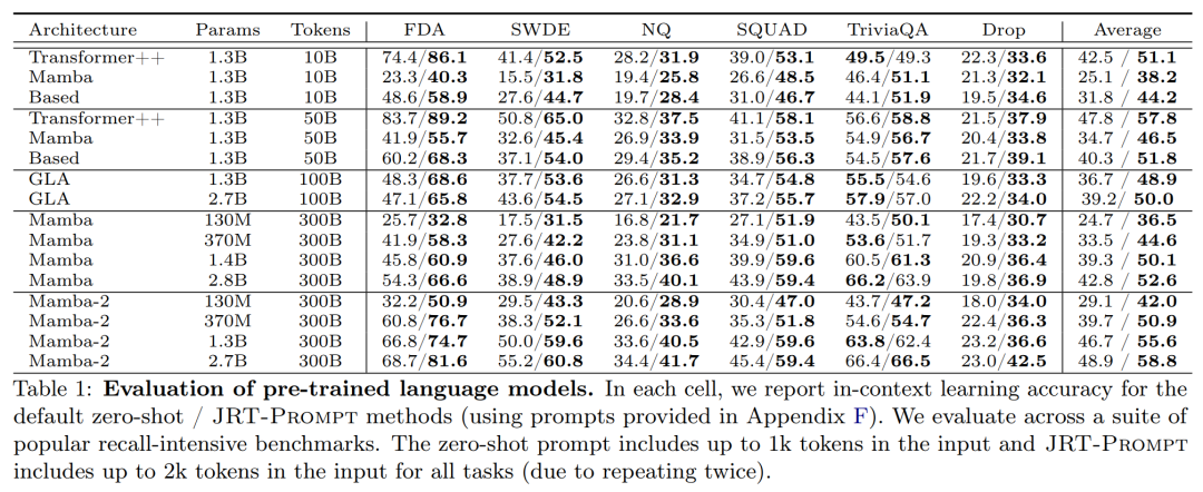 此外,JRT-Prompt 可以与现成的 LLM 一起使用。研究者在零样本提示下,在一系列记忆密集型上下文任务上评估了以下 LM: