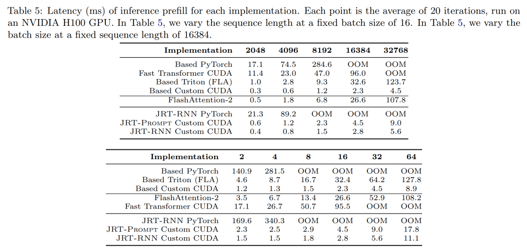 使用 Simran Arora 等人论文《Simple linear attention language models balance the recall-throughput tradeof》中提出的 Based CUDAn 内核,JRT-Prompt 在处理 prefill 时吞吐量分别是 FlashAttention-2 和 FLA Triton 内核的 11.9 和 13.7 倍,如下表 5 所示。