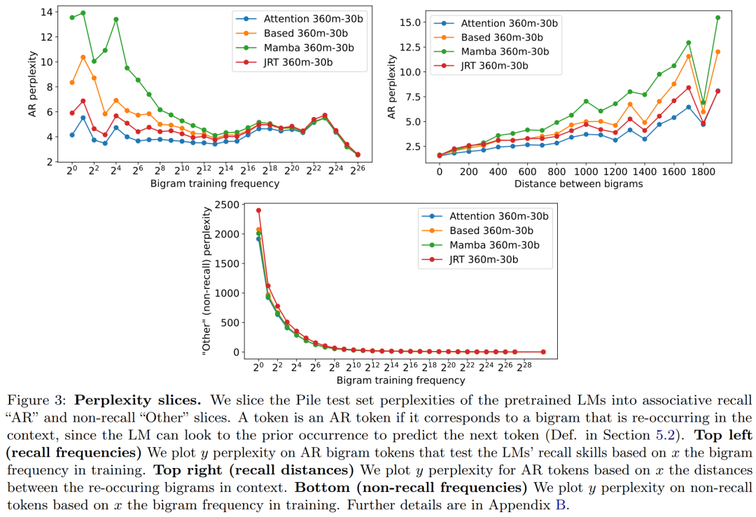 对于记忆频率,JRT-RNN 在「AR slice」表现出色。对于训练期间不常见的二元组(即不太可能在模型参数中被记住的),JRT-RNN 的困惑度相对于 Based 和 Mamba 这两个强大的因果循环基线有所改善。