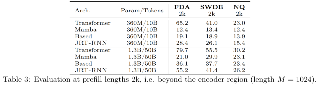 如下表 2 所示,研究者发现,JRT-RNN 在参数为 360M(30B tokens)时比仅解码器的基线(Based)平均高出 13.7 个百分点,在参数为 1.3B(50B tokens)时平均高出 6.9 个百分点。