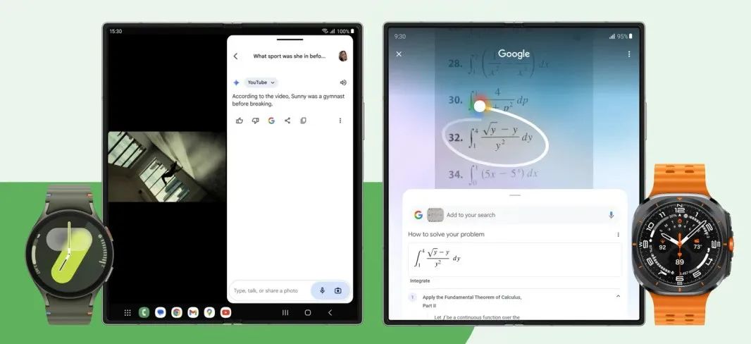 配合全新的 Galaxy Z 系列,Gemini 将根据屏幕上的内容迅速提供相关建议。只需轻扫屏幕角落或者说 "嘿,Google",即可调出 Gemini。如果您正在 YouTube 上观看视频,就会出现 "询问视频相关问题" 的建议。Galaxy Z Fold6 的大屏幕特别适合多任务处理。不久之后,您将能在观看视频时,调出并移动 Gemini 叠层,获得分屏体验。