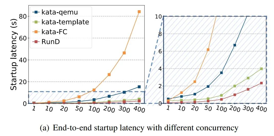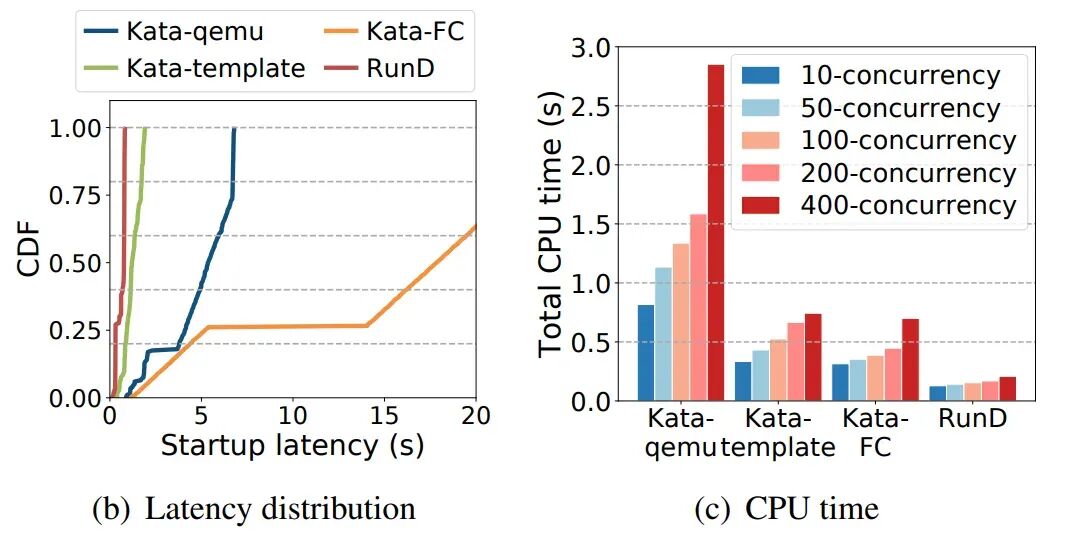 并发性能总结:RunD能够在88ms内启动一个单独沙盒,并具备在 1 秒内同时启动 200个沙箱的并发能力,与现有技术相比,具有最小的延迟波动和CPU开销。