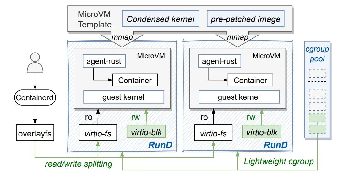RunD设计并总结了host-to-guest的全栈解决方案。RunD运行时通过virtio-fs提供只读层,使用built-in storage为virtio-blk创建一个非持久的读写层,并使用 overlayfs将前者和后者挂载为最终的容器rootfs,从而进行读/写分离。RunD利用集成了精简内核的microVM模板,并采用预处理的镜像创建一个新的microVM,进一步分摊了不同的microVM的开销。在创建安全容器时,RunD从cgroup池绑定一个轻量级的cgroup进行资源管理。