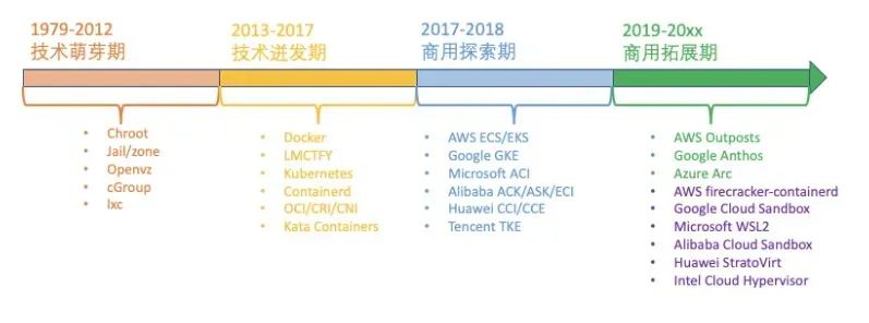容器技术近 20 年的发展历史,大致可以将其分为四个历史阶段。