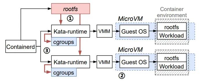 以kata作为容器运行时,并发瓶颈点在于创建rootfs(红色块步骤1)和创建cgroups(红色线步骤3)密度瓶颈点在于MicroVM的高额内存开销(蓝色块步骤2)和大量cgroups的调度维护开销(蓝色块步骤3)。