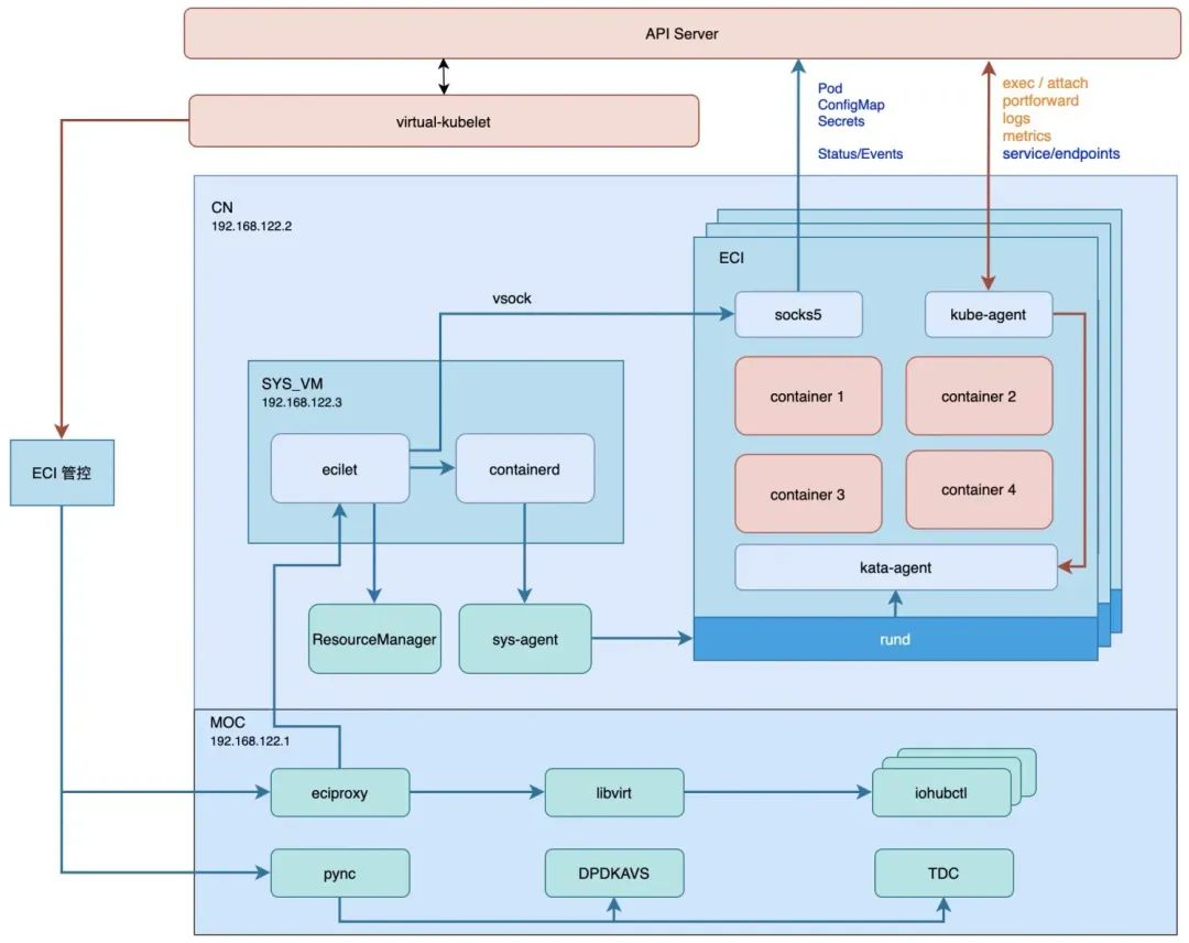 4、containerd调用cn上的sys-agent(由于containerd置于sysvm内,无法与rund直接通讯,所以需要sys-agent进行转发请求)进而调用rund生产sandbox,rund guest内的containerd拉取容器镜像,进而kata-agent生产容器。至此一台完整的ECI实例被生产出来,用户可以欢快地跑自己的应用了。