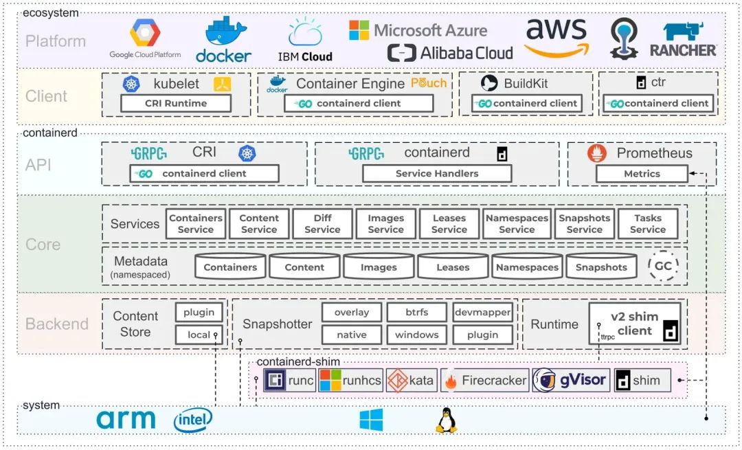 OCI标准支持,对遵循 Open Container Initiative(OCI) 标准,这意味着它与符合 OCI 规范的容器和镜像兼容。这种标准化使得 containerd 能够与其他符合同一规范的工具和平台集成;