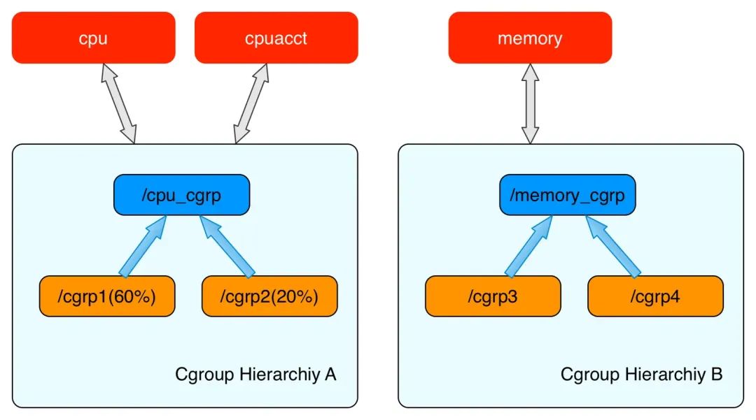 每一个层级结构中是一颗树形结构,树的每一个节点是一个cgroup结构体(比如cpu_cgrp, memory_cgrp)。第一个cgroups层级结构attach了cpu子系统和cpuacct子系统, 当前cgroups层级结构中的cgroup结构体就可以对cpu的资源进行限制,并且对进程的cpu使用情况进行统计。第二个cgroups层级结构attach了memory子系统,当前cgroups层级结构中的cgroup结构体就可以对memory的资源进行限制。