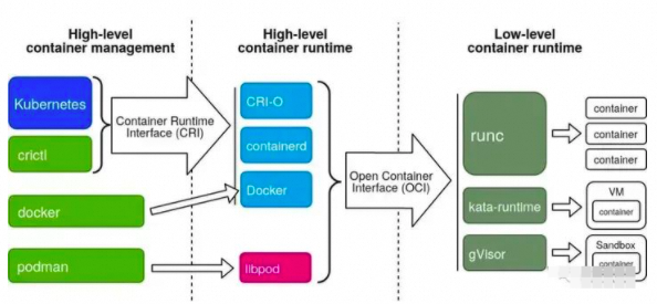 2.支持更多高级功能,例如镜像管理、CRI实现的运行时被称为高层运行时(high-level container runtime),目前应用最广泛高层运行时是containerd和cri-o。