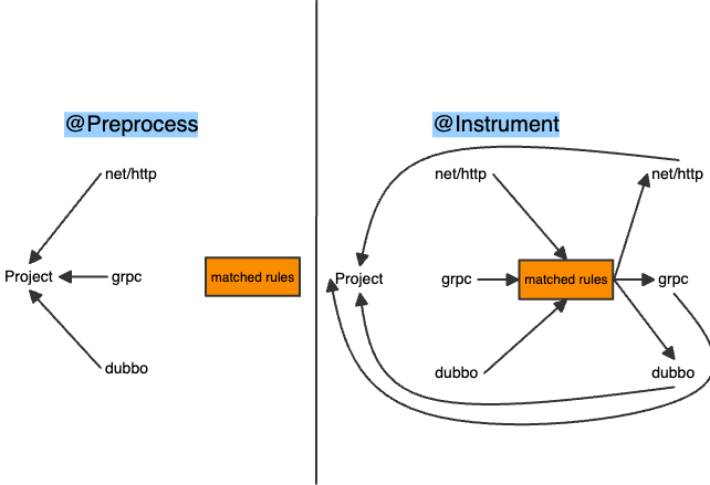 当所有预处理工作准备就绪,会调用go build -toolexec aliyun-go-agent cmd/app进行编译。-toolexec参数是自动插桩的核心,用于拦截常规的构建流程,替换为用户自定义的工具,使开发者可以更灵活地定制构建过程。这里唤起的 aliyun-go-agent 就是自动插桩工具,从而进入代码注入阶段。