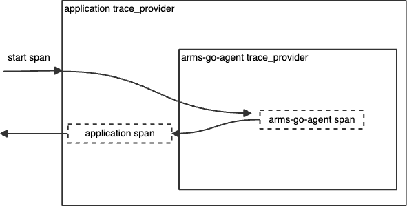所谓shadow机制是指ARMS Go Agent自身维护一套最小依赖的OpenTelemetry SDK,并修改包名和删除不必要的依赖,避免编译时的依赖冲突。同时,ARMS Go Agent使用桥接器模式来了一套“移花接木”,即将用户业务代码中的trace_provider包装为ARMS Go Agent提供的trace_provider,从而将用户业务代码中生成的Span桥接到ARMS Go Agent生成的Span。