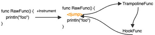 首先,我们区分以下三种类型的函数:RawFunc,TrampolineFunc,HookFunc。RawFunc是需要注入的原函数。TrampolineFunc是跳床函数。HookFunc是onEnter/onExit这些需要插入到原函数入口、退出的埋点代码。RawFunc 通过插入的TJump跳转到TrampolineFunc,然后TrampolineFunc构造上下文、准备recover错误处理,最后跳转到HookFunc执行埋点代码。