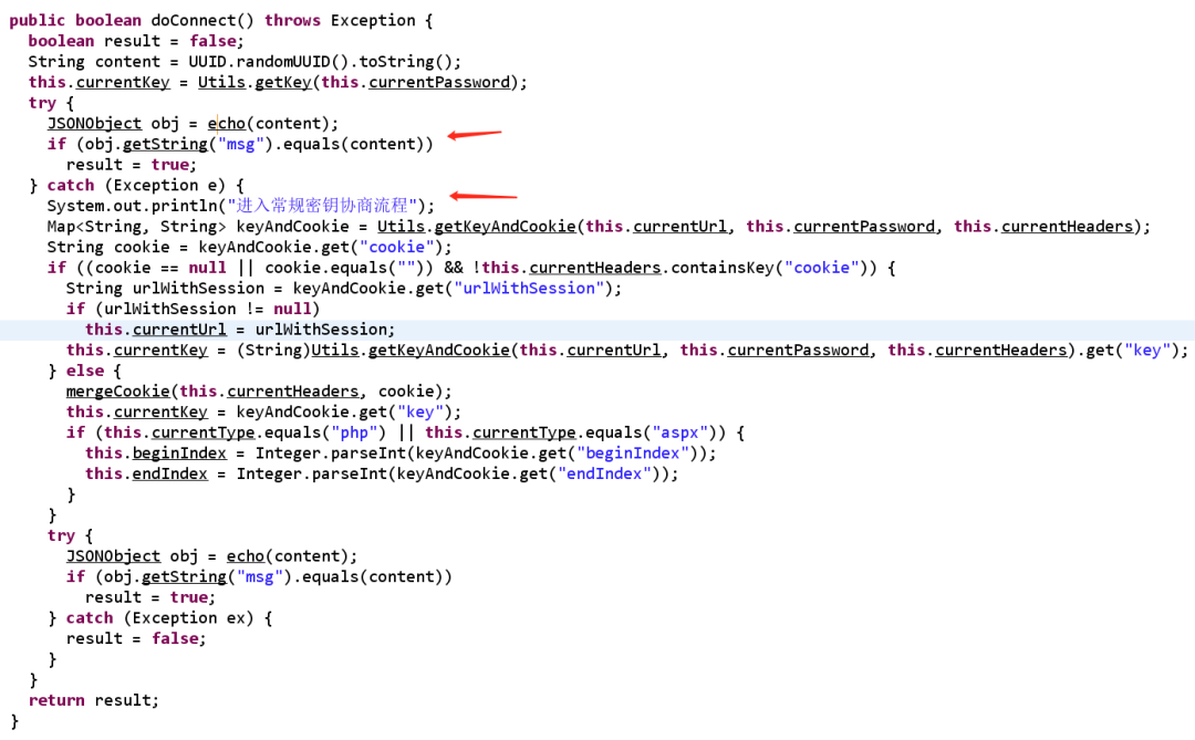 通过代码逆向分析可知,通过异常处理的方式,在连接时,也就是第一个数据包,会生成随机的UUID字符串,如果比较相同则返回真(如果第一个包解密成功,这里是PHP,则会输出数据,进行比较),如果失败则进入异常处理流程-这里指密钥协商流程。