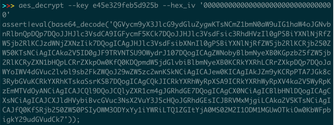 下面尝试解密第一个认证数据包,首先进行base64解密,然后使用aes的cbc模式进行解密,aes解密后出现2部分,以|分割,前面是assert后面是eval的base64的代码片段。(beta2版本)