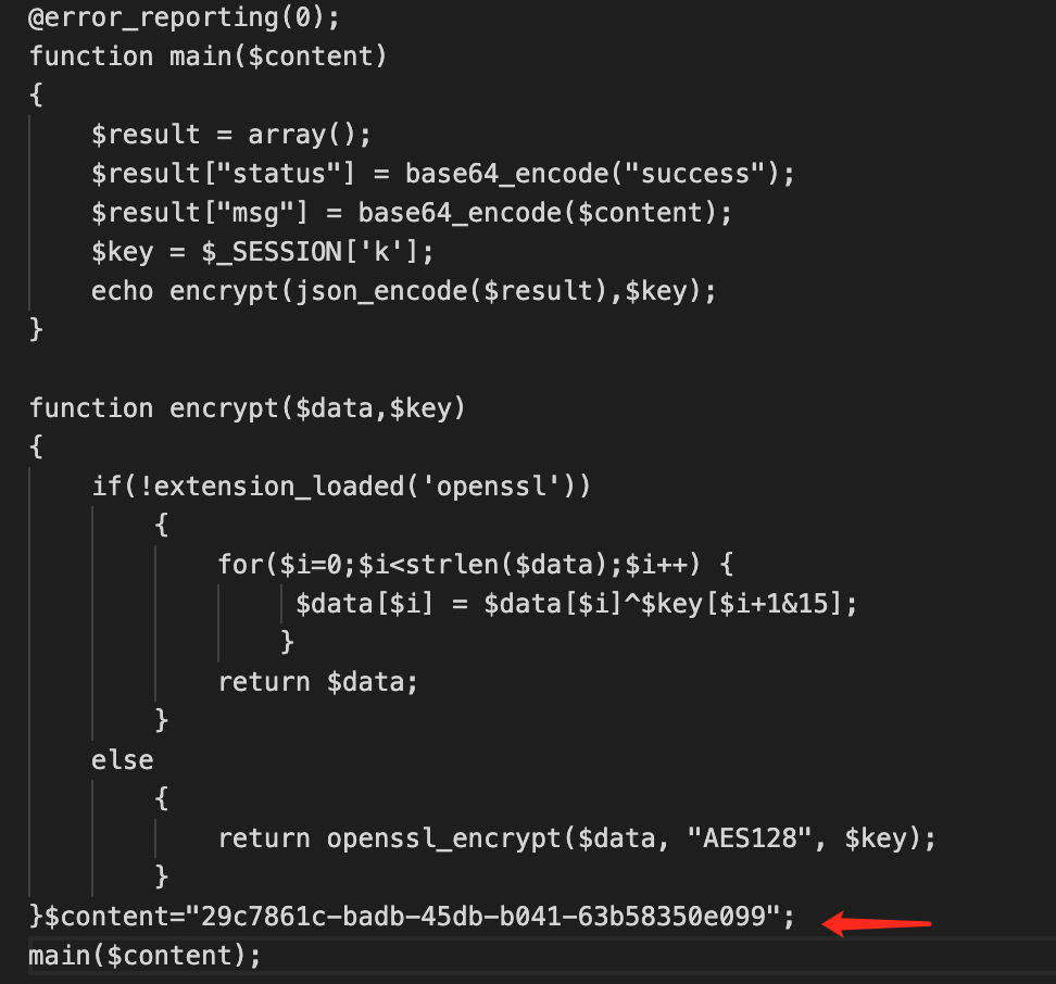 这里的数据包能够通过AES密码进行解密,后面在正确密码时演示解密过程。上述数据解密后主要代码如下,主要目的在于设置$content变量,其时通过UUID生成,用于后续做校验(见java代码)。