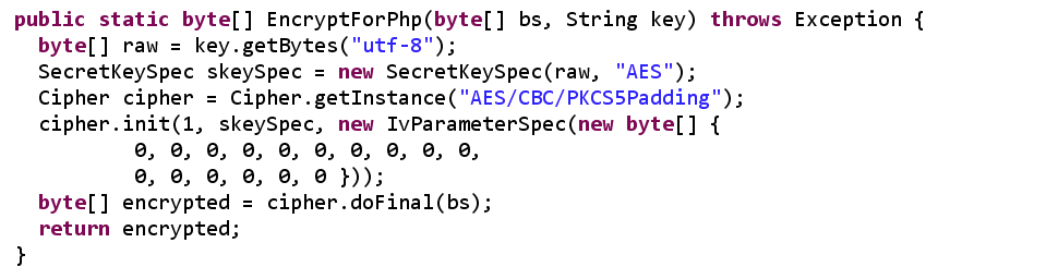 逆向分析可知PHP脚本的AES加密方式为CBC模式,填充方式为PKCS5Padding,默认的IV值(固定值)为16个0x00。(beta2版本和beta3版本相同)