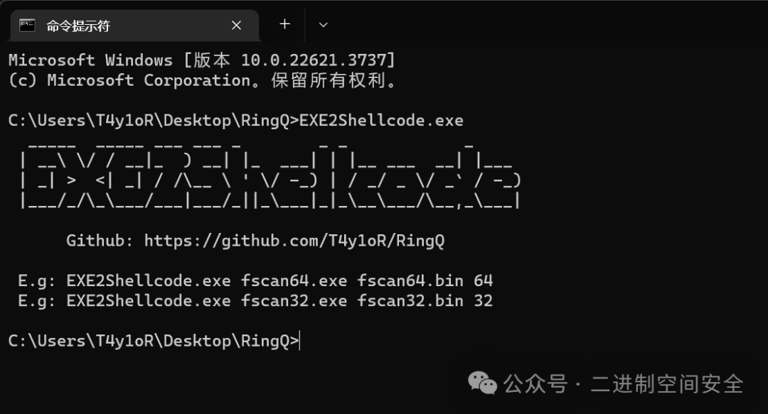 EXE2Shellcode.exe生成后的Shellcode需要自行混淆+修改RingQ源码加载使用, 如图: